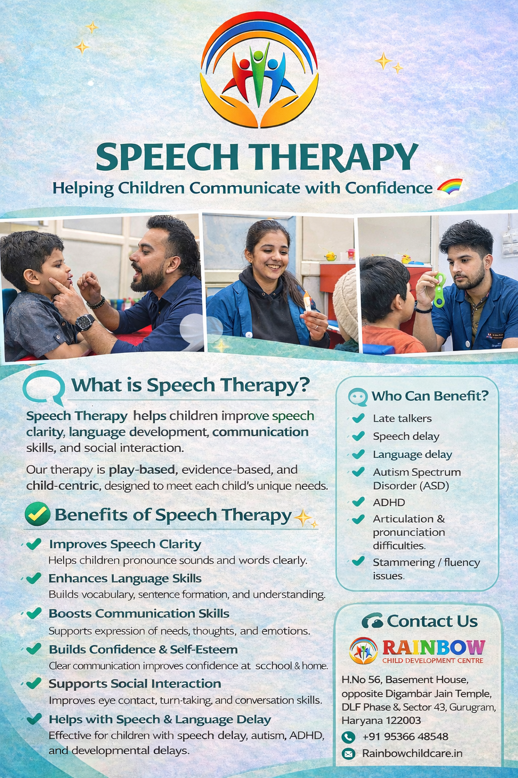 Rainbow Child Development Centre in Gurgaon, Haryana, provides specialized care for children through occupational therapy, speech and hearing therapy, ABA, special education, and child psychiatry. As a leading occupational therapy centre in Gurgaon, we enhance motor skills, sensory processing, and independence. We also offer expert speech therapy in Gurgaon to improve communication and language. Renowned for effective autism treatment in Gurgaon, we deliver personalized programs, making us a trusted autism centre in Gurgaon. Our skilled special educators in Gurgaon provide tailored learning plans, positioning us among the top special schools in Gurgaon, special education schools in Gurgaon, and centers for comprehensive therapy in Gurgaon.